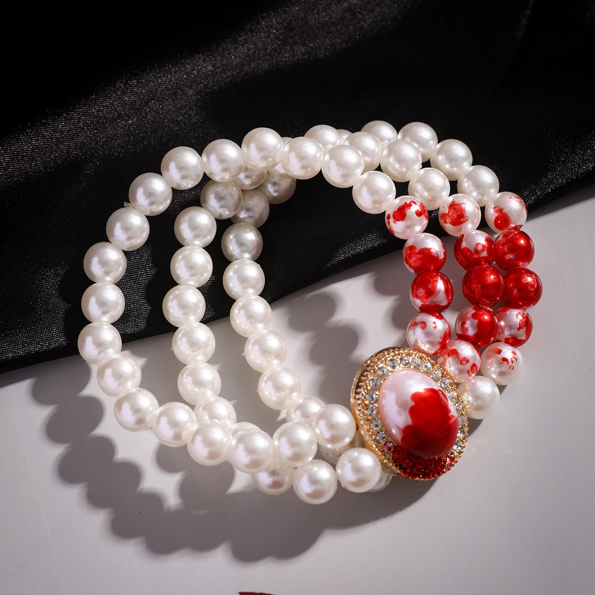 Enhance your punk style with the Goth Creative Red Blood Pattern Imitation Pearl Chain Bracelet. This unique bracelet features a long tassel pendant and trendy blood patterned beads. Perfect for Halloween or as a statement piece, this bracelet will add edge to any outfit.