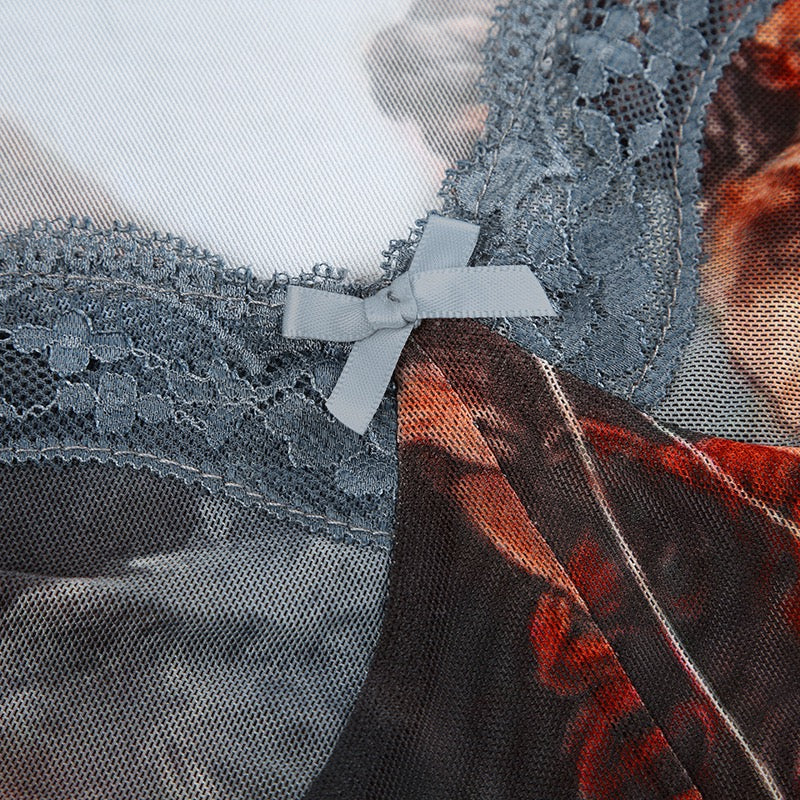 Square Neck Mesh Bodysuits Women Vintage Canvas Printed Lace Bow Brown Retro High Waist Wrapping Halloween Christmas