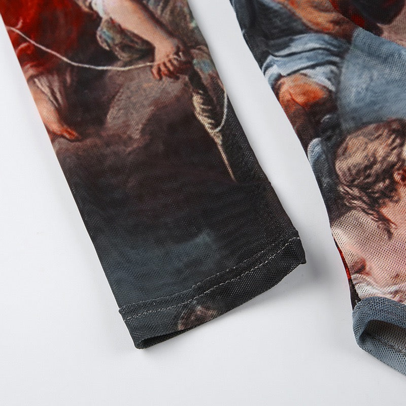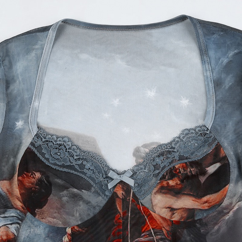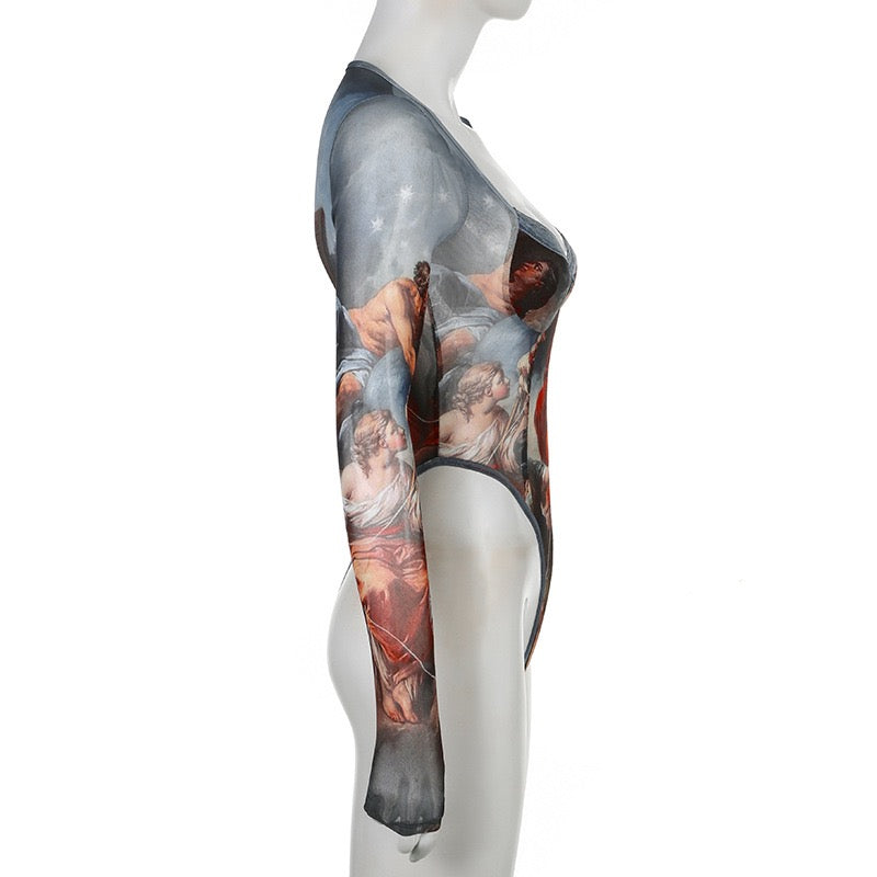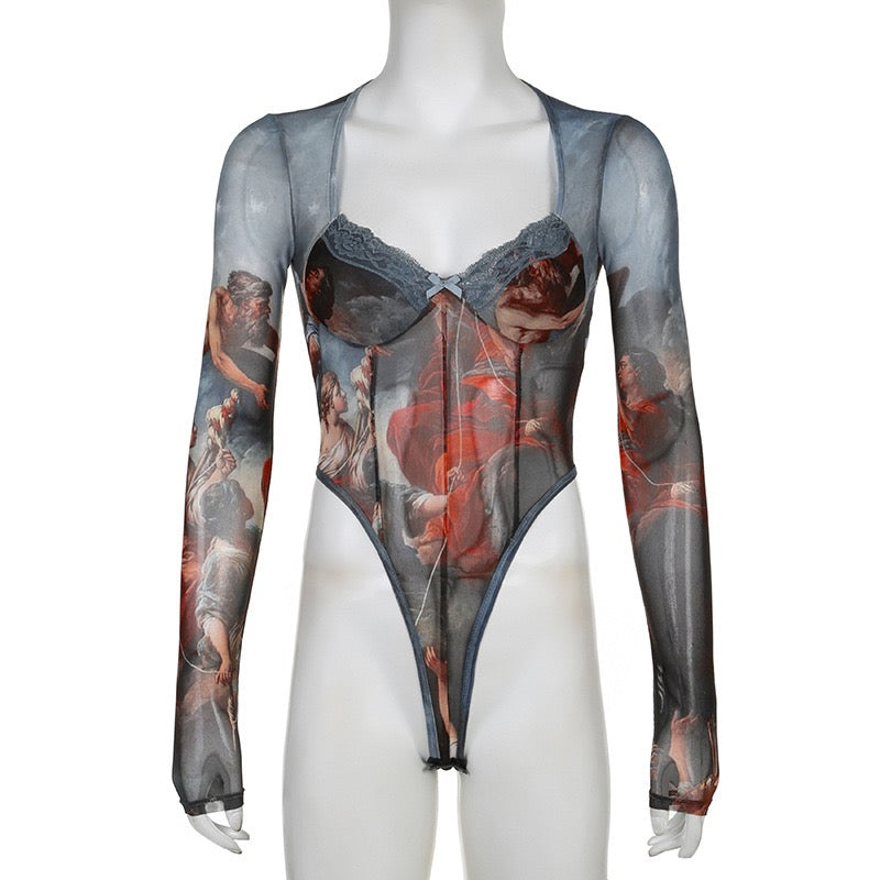 Introducing our vintage canvas printed lace bodysuits for women! Featuring a square neck and high waist wrapping, this stylish bodysuit is perfect for Halloween or Christmas. Made with breathable mesh for ultimate comfort. Stand out in style with a touch of retro elegance.